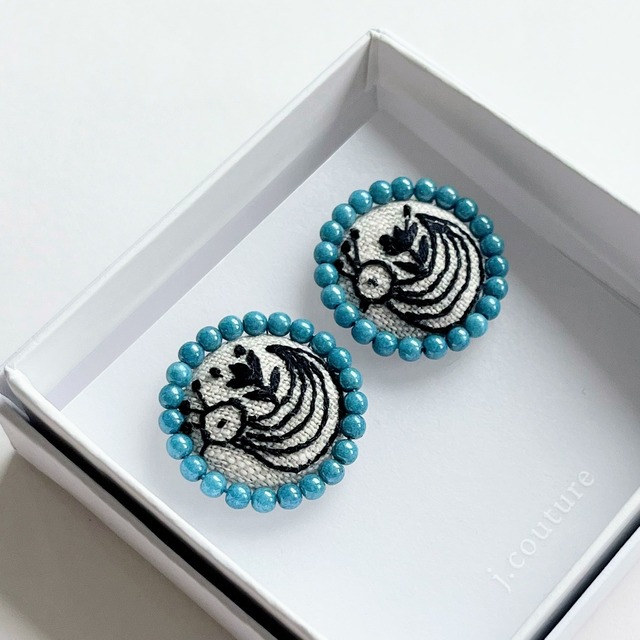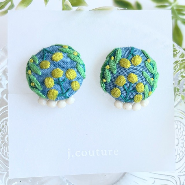 少しくすみのあるブルーののコットン地にのミモザを丁寧に手刺繍しました。 ミルキィホワイトの小粒のチェコカットビーズをあしらいました。サークル22ミリ、ビーズ3ミリ 金具部分は、真鍮メッキのネジ式イヤリングです。 他の金具への変更はできません。 ✳刺繍部分は、ひっかけ、摩擦に弱いのでご注意ください。 ✳水に濡らさないで下さい。 *お使いいただくうちに経年による色あせ、毛羽立ち等ある場合もございます。 ✳️ご使用にならない時はなるべく直射日光の当たらない湿気の少ない場所での保管をお勧めします。 ✳他のウェブサイトで掲載している作品もあります。タイミングによりましては品切となる場合もありますが、お時間をいただいて【10日程度】お作りいたします。また、手刺繍の特性上同じデザインでも個体差があります #刺繍 #刺繍イヤリング #ミモザのイヤリング #動物刺繍 #とり好き #とり雑貨 #とり刺繍ピアス #ことり好き #ことり雑貨 #ことり刺繍 #ことりグッズ #ねこ好き #ねこ雑貨 #ねこ刺繍ピアス #ねこグッズ #ミモザ #贈り物 #プレゼント #ギフト #おしゃれギフト #一点もの #オリジナルデザイン #embroidery #ハンドメイド #手芸 #おうち時間 #手仕事 #手縫い #チタンポスト