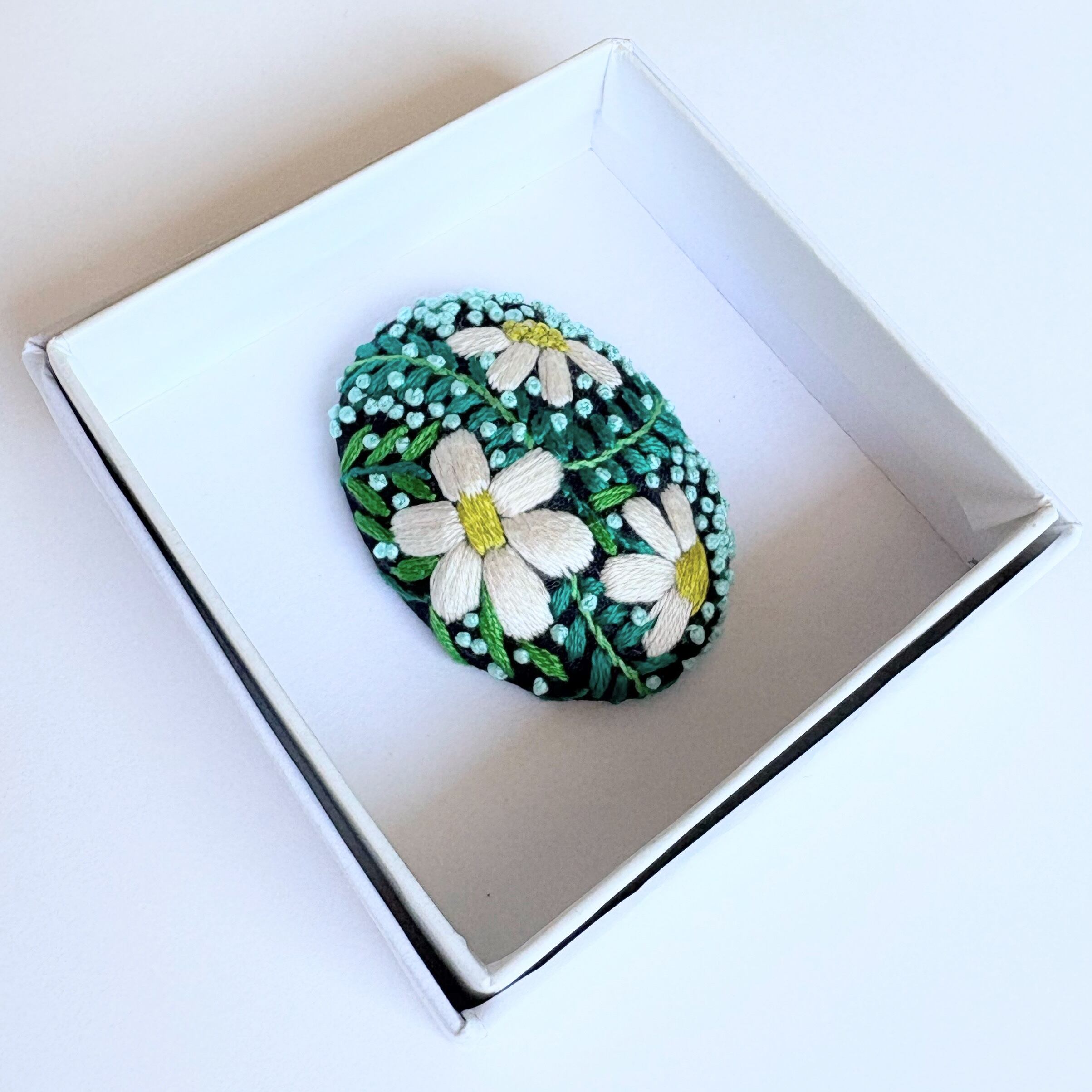 j.coutureの刺繍ブローチは、様々なお召し物に合わせやすくさりげないおしゃれを演出します。