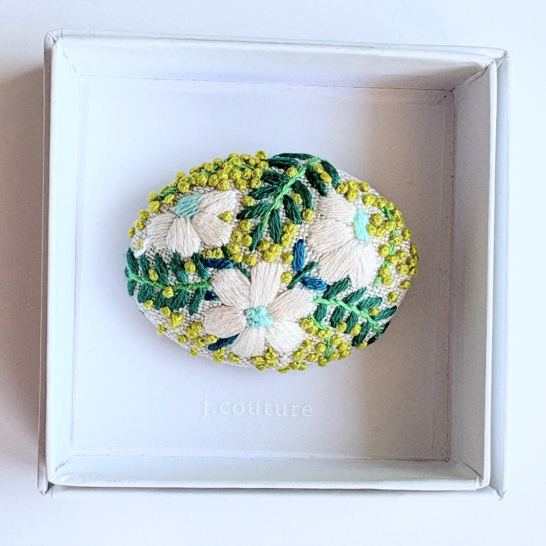リネン地に人気のミモザと白い小さなお花を丁寧に手刺繍しました。