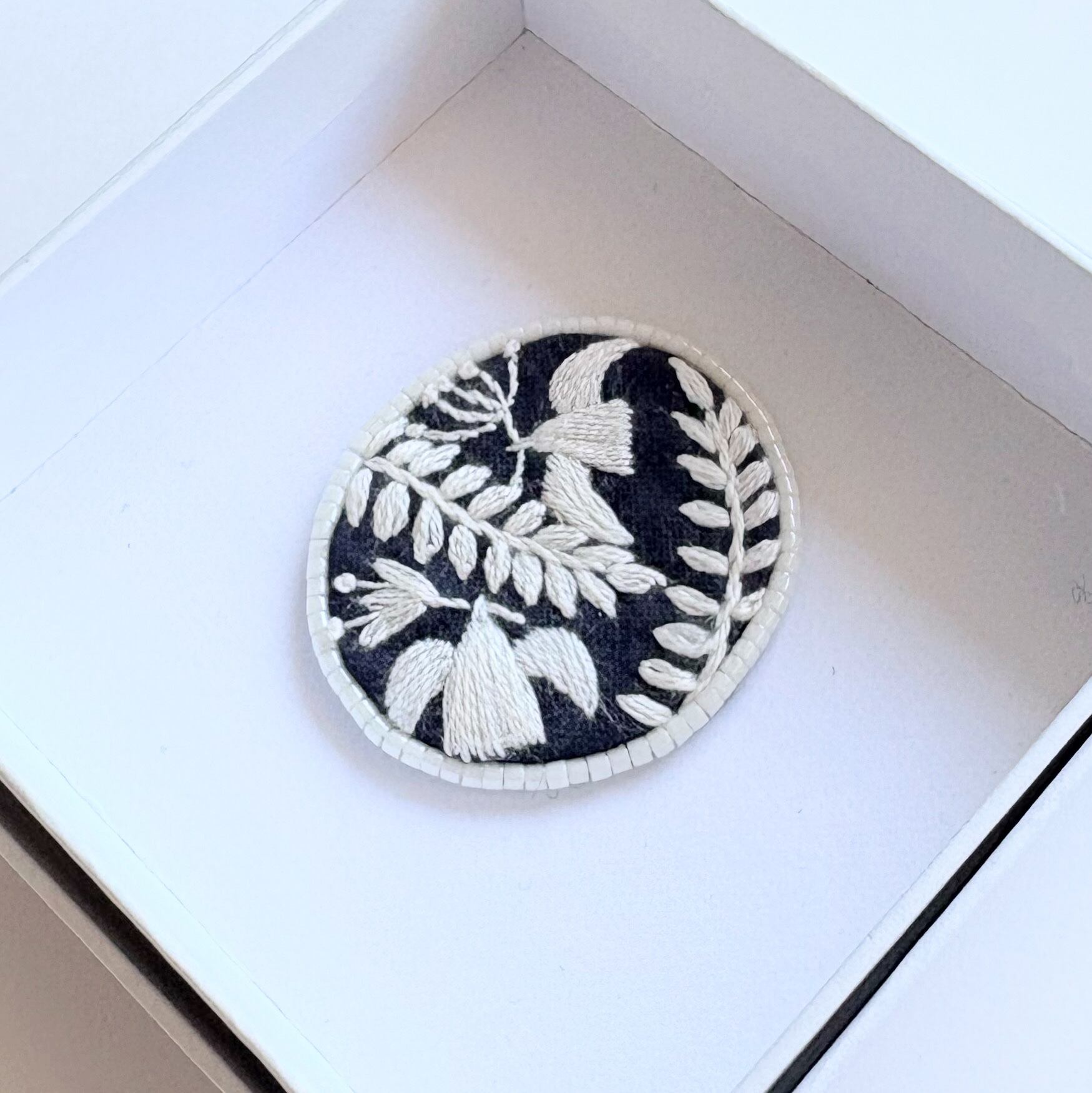 黒に近い濃紺(ネイビー)のコットン地にことりと草花を素朴な北欧風のデザインで丁寧に手刺繍しました。