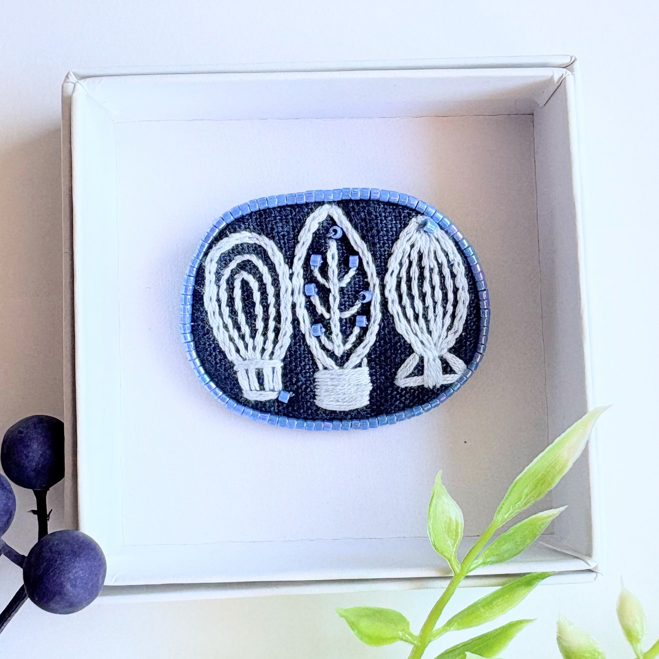 インディゴブルーのリネン地に小さな木の葉を丁寧に刺繍しました。同系色の極小ビーズをあしらっています。素朴な北欧風のデザインです。