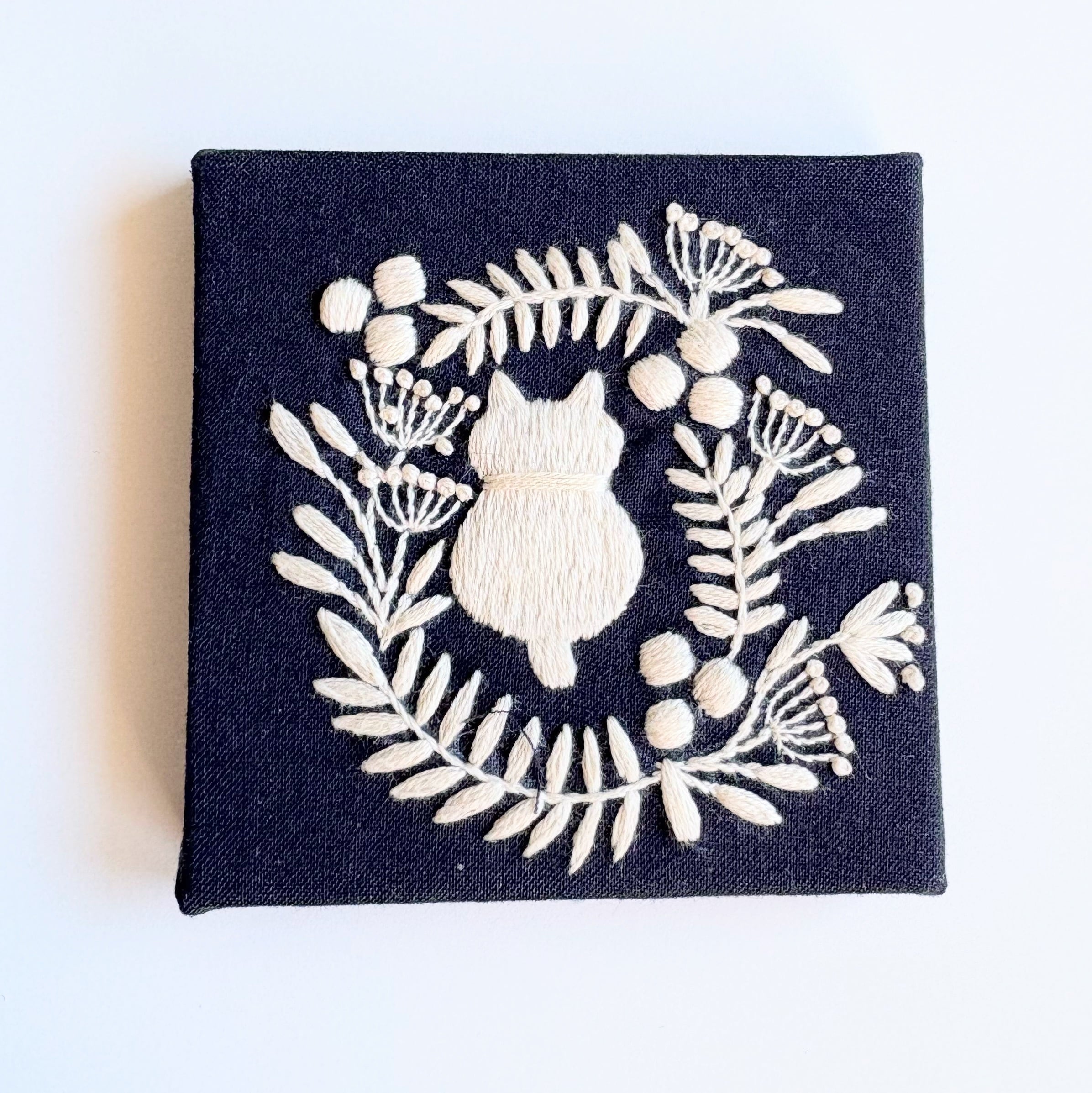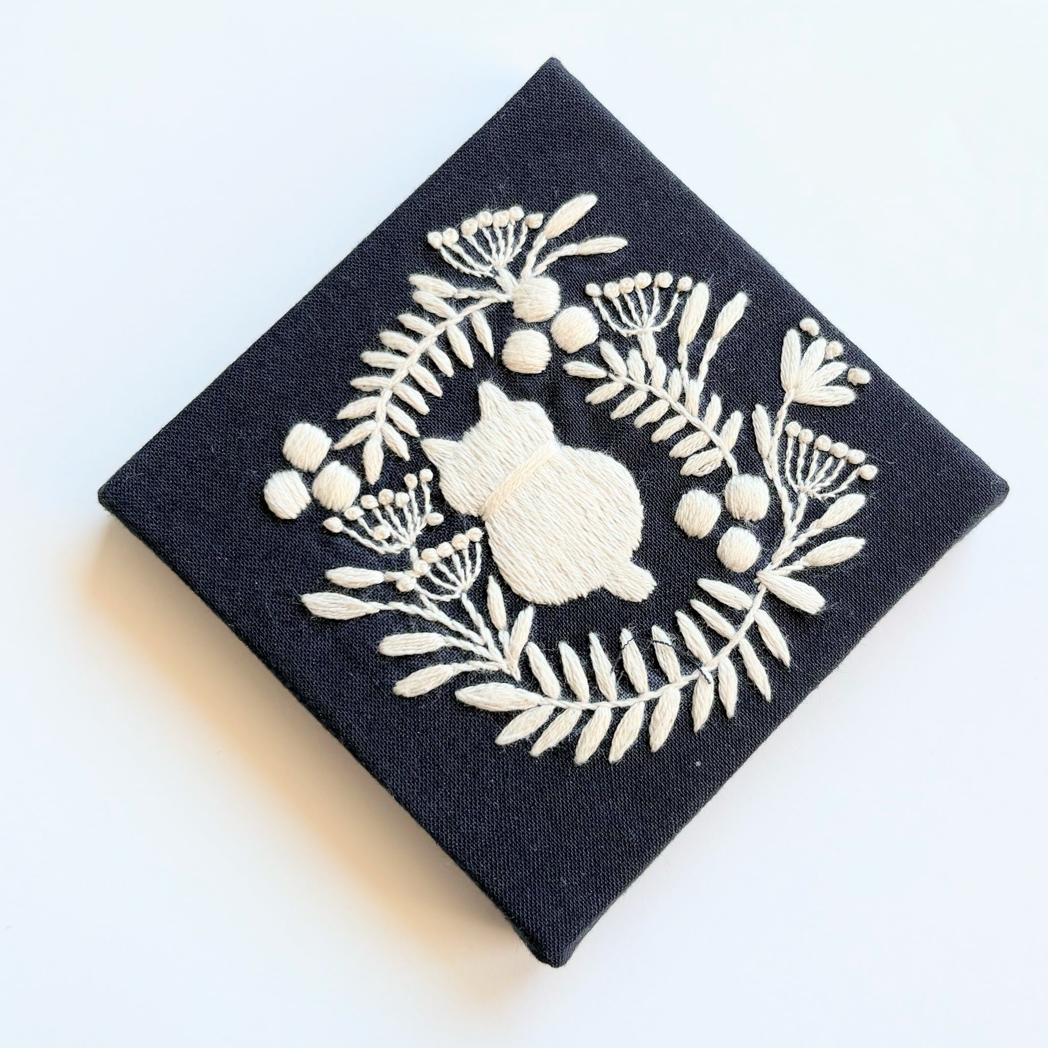 黒に近い濃紺(ネイビー)のコットンにシックな色合いでこねこと草花を丁寧に手刺繍しました。シンプルでありながら心温まる素朴な北欧風のデザインです。