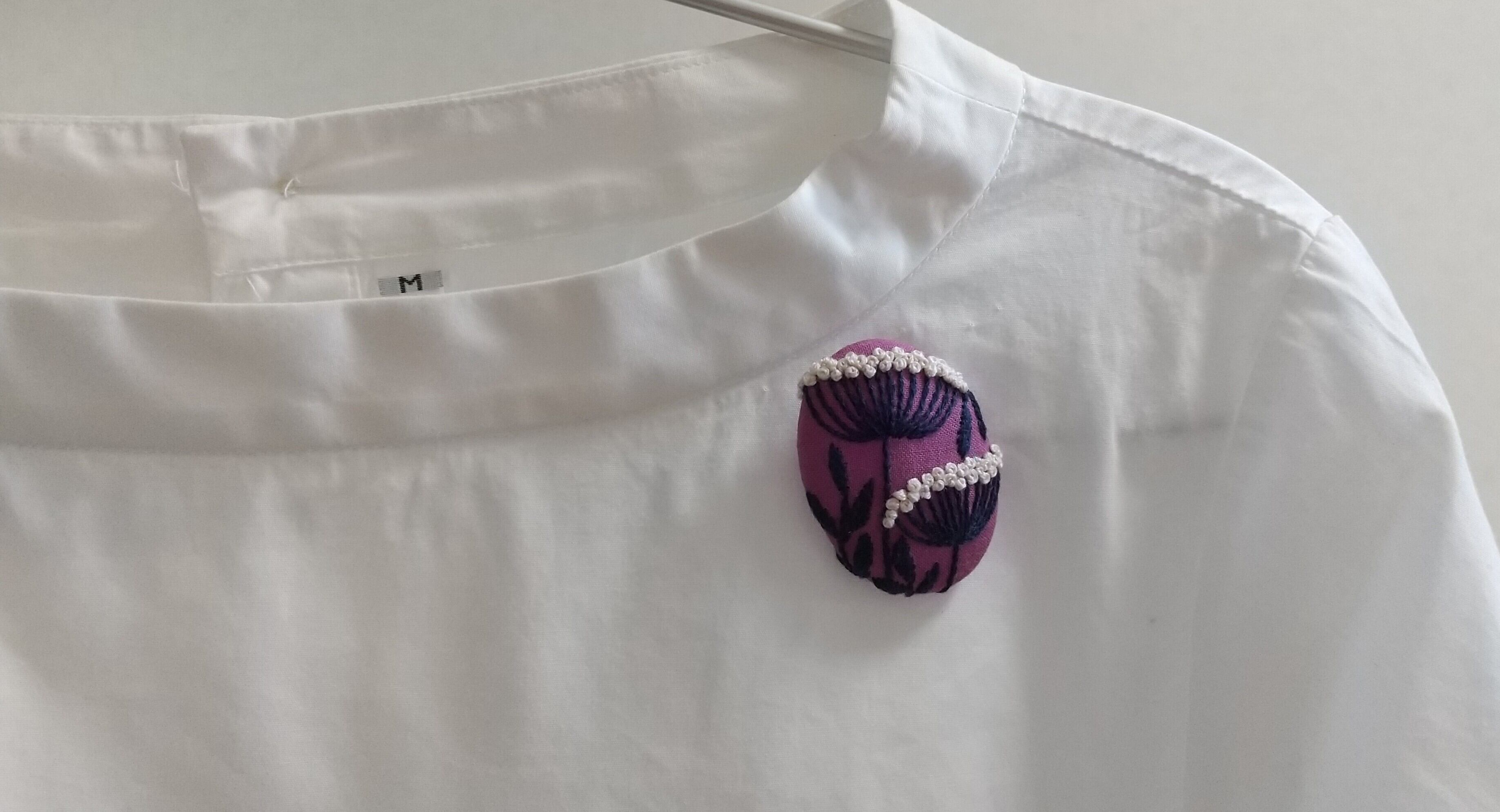 深いラベンダー色のコットン地に大人可愛い草花を手刺繍しました。