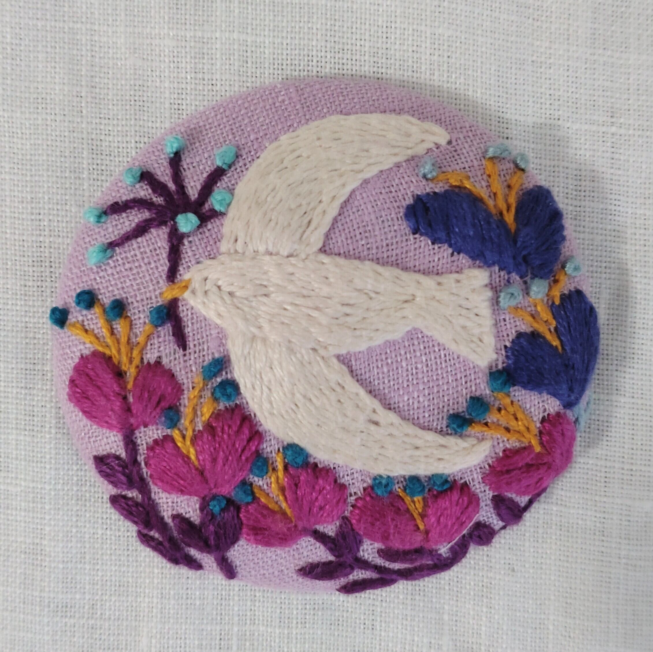 ラベンダーピンクのリネン地にことりと草花を手刺繍しました。