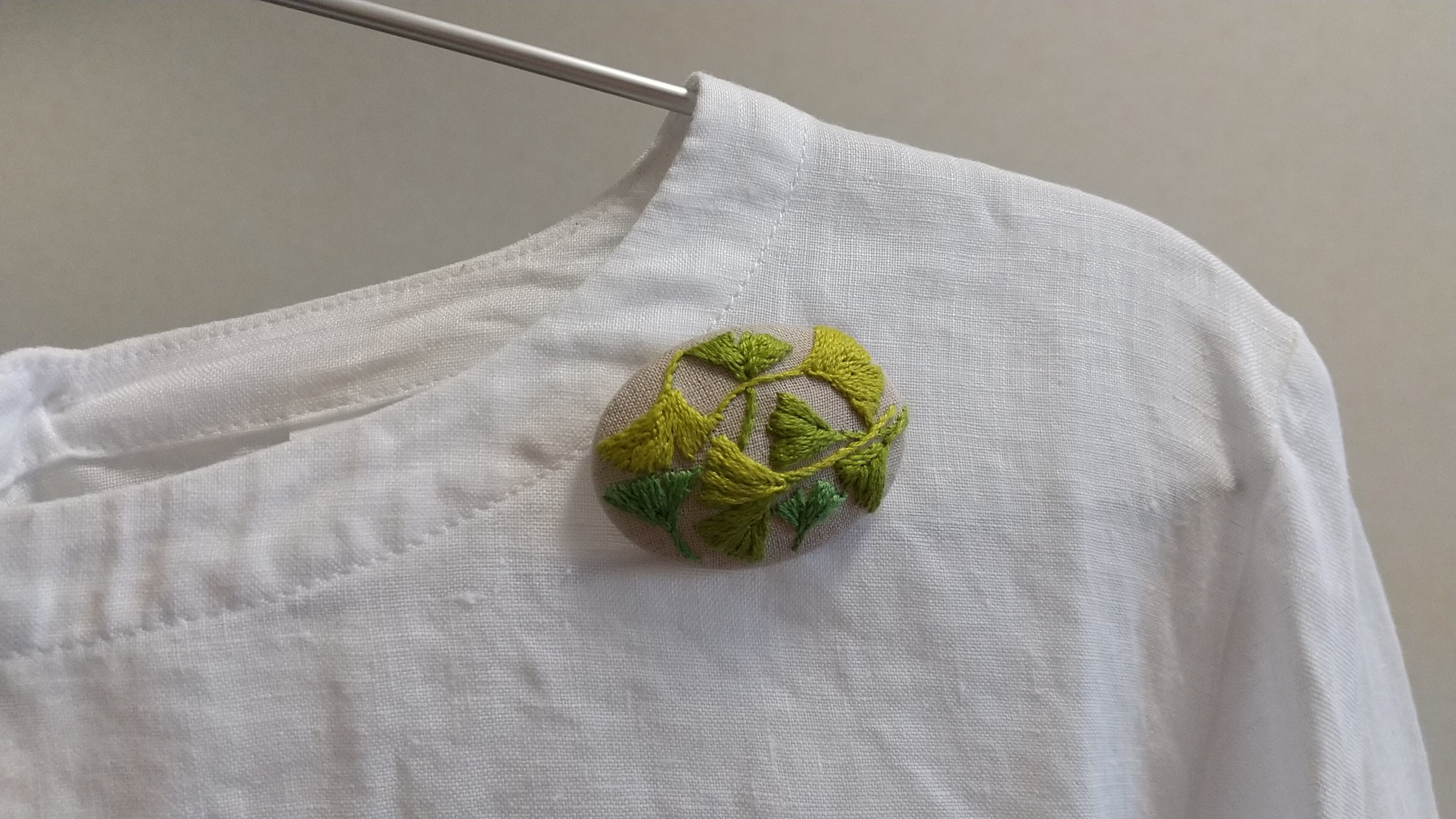 綿麻地に色付き始めたいちょうの葉を刺繍しましたを手刺繍しました。