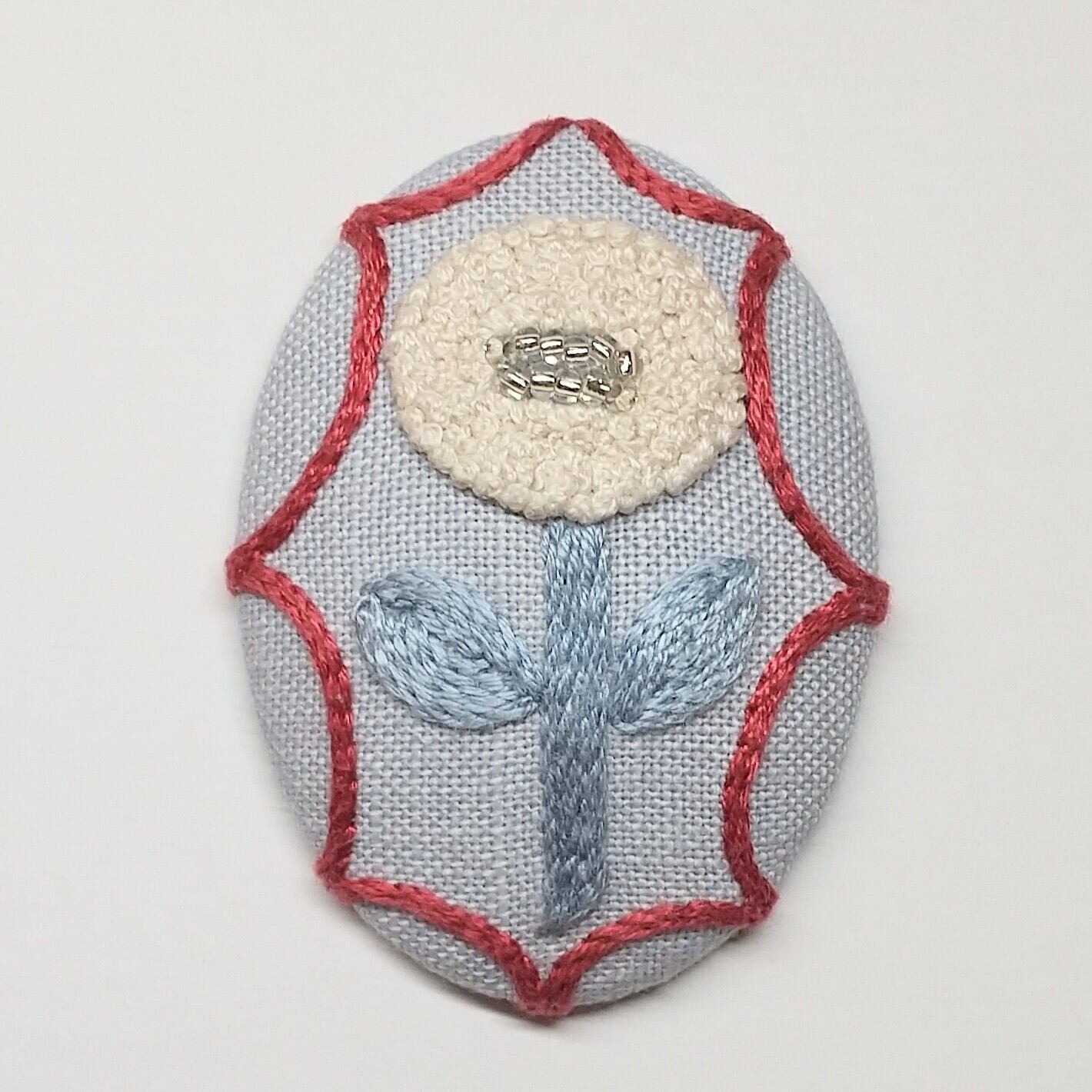 ブルーがかったライトグレーのコットン地に北欧風のデザイン。花芯にビーズをあしらった小さなお花を手刺繍しました。