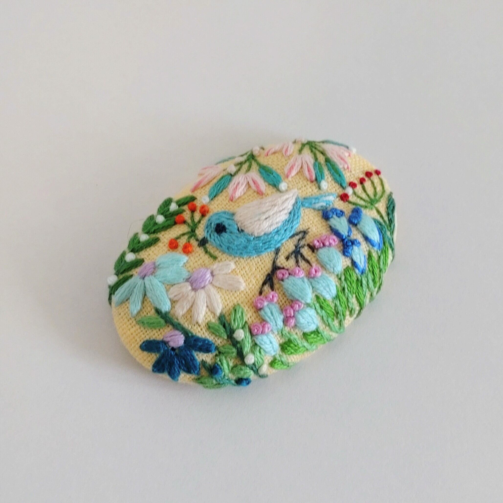 ことりと草花の刺繍ブローチ【botanical】b103