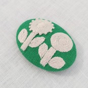 発色の良い明るめのグリーンのリネンにオフホワイトの糸。北欧風の素朴なデザインで小さなお花を丁寧に刺繍しました。