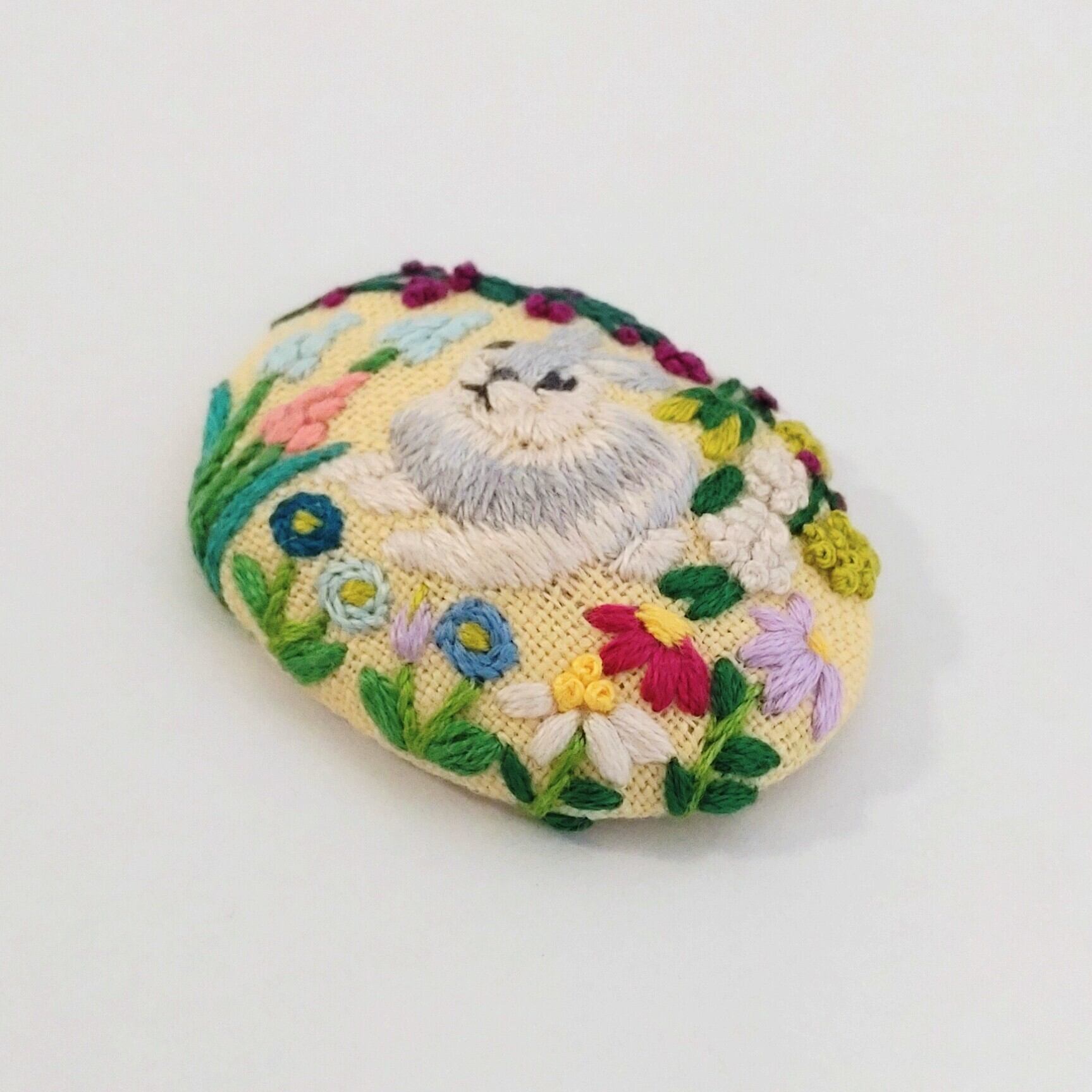 ウサギと草花の刺繍ブローチ【botanical】b116