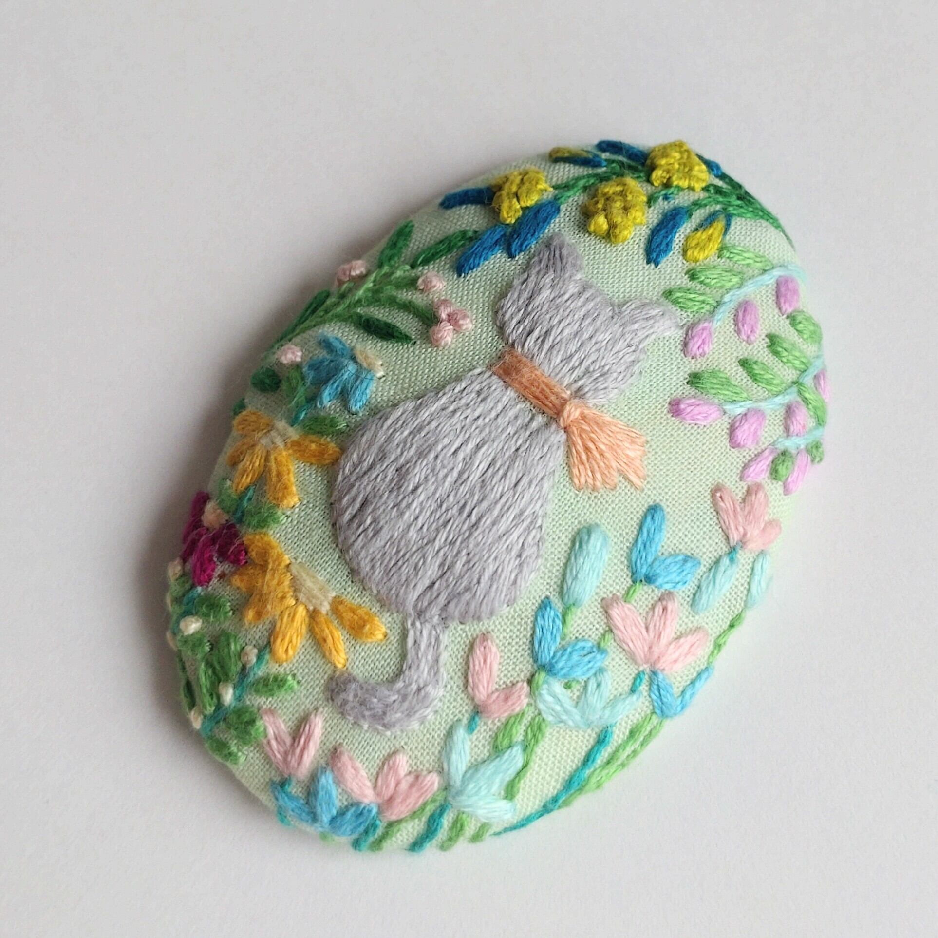 あわいライムグリーンのコットン地にこねこと小さなお花を彩りよく丁寧に手刺繍しました。