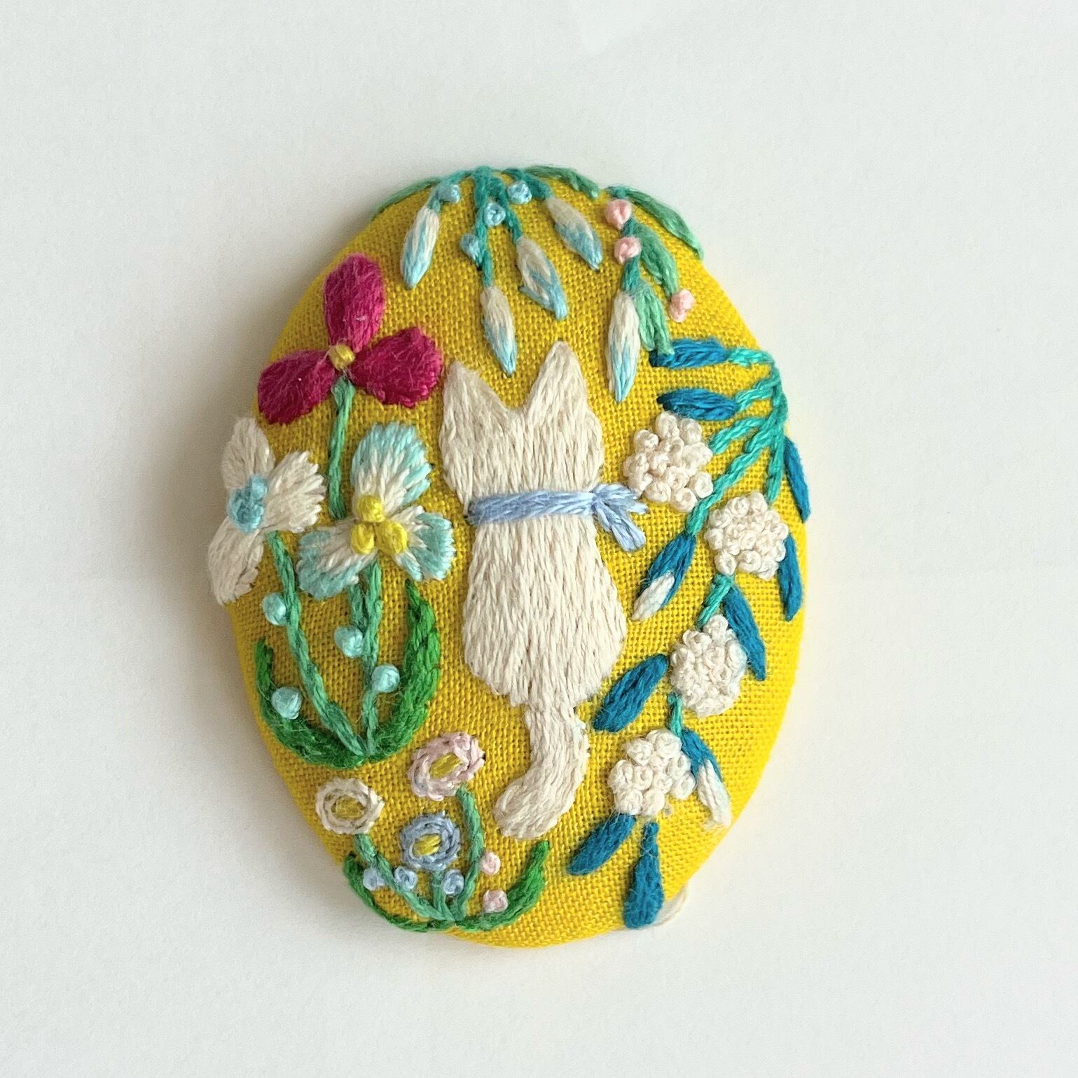 マスタードイエローコットン地に小さなねこと草花を彩り良く丁寧に手刺繍しました。