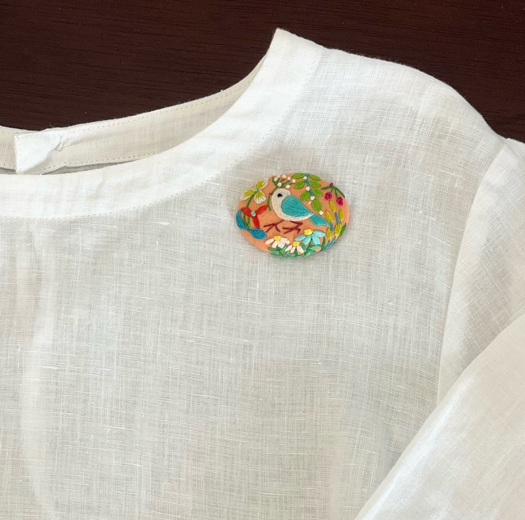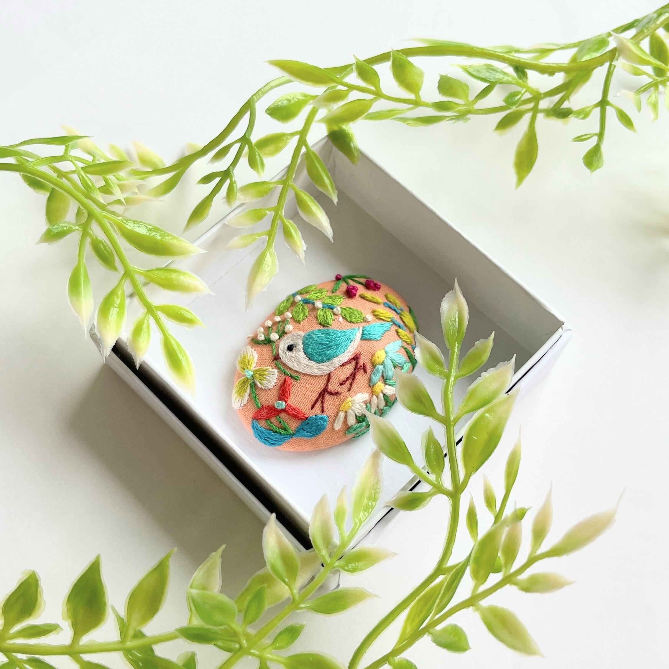 サーモンオレンジのコットン地にことりと小さな草花を彩り良く丁寧に手刺繍しました。