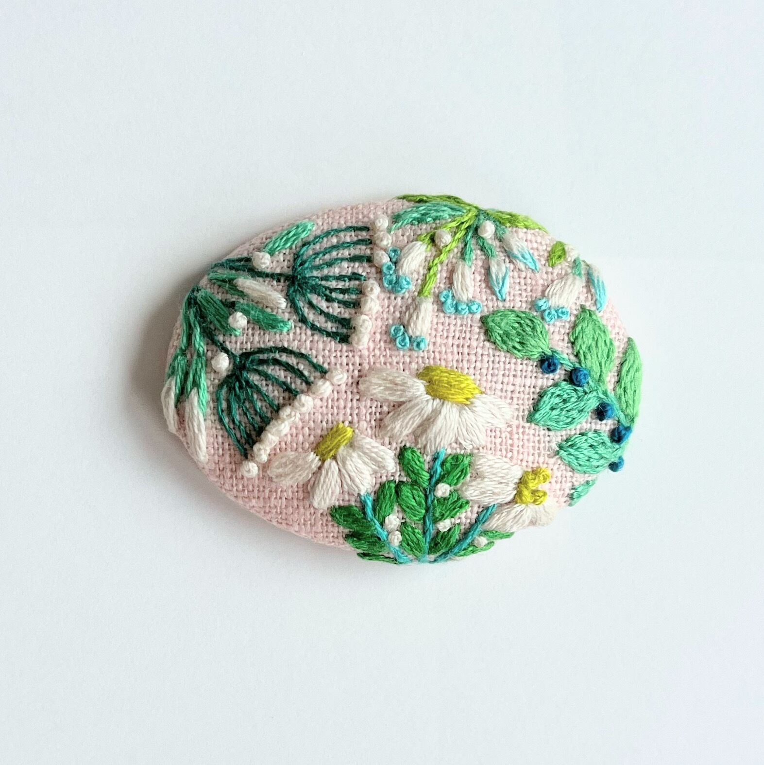 淡いピンクのリネン地に涼やかな色合わせで小さな草花を丁寧に手刺繍しました。