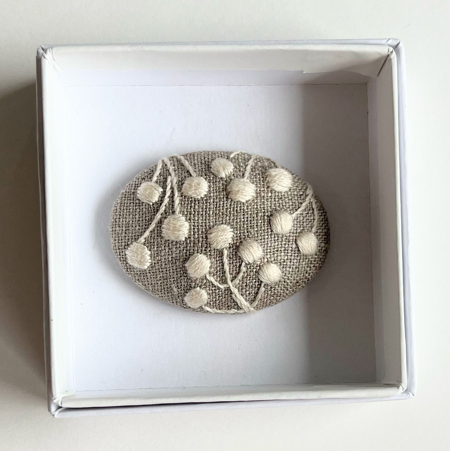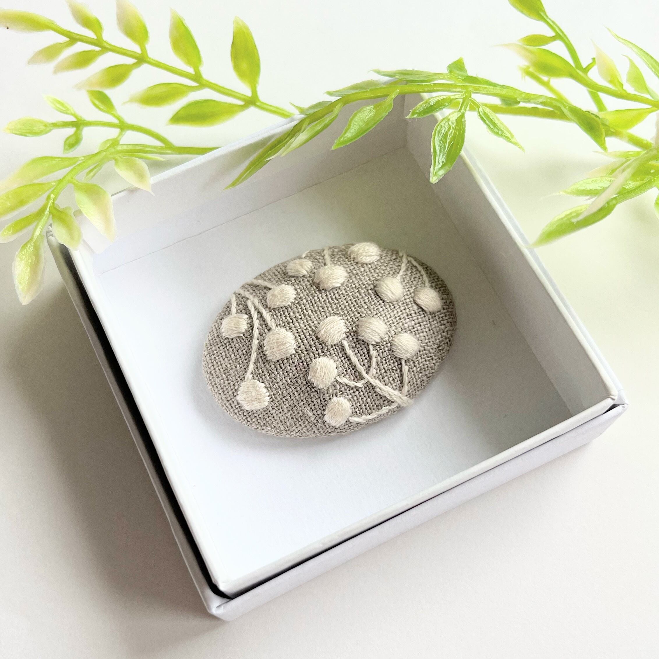 グレージュのリネン地にオフホワイトの糸。北欧風の素朴で可愛いデザインで木の実を丁寧に手刺繍しました。
