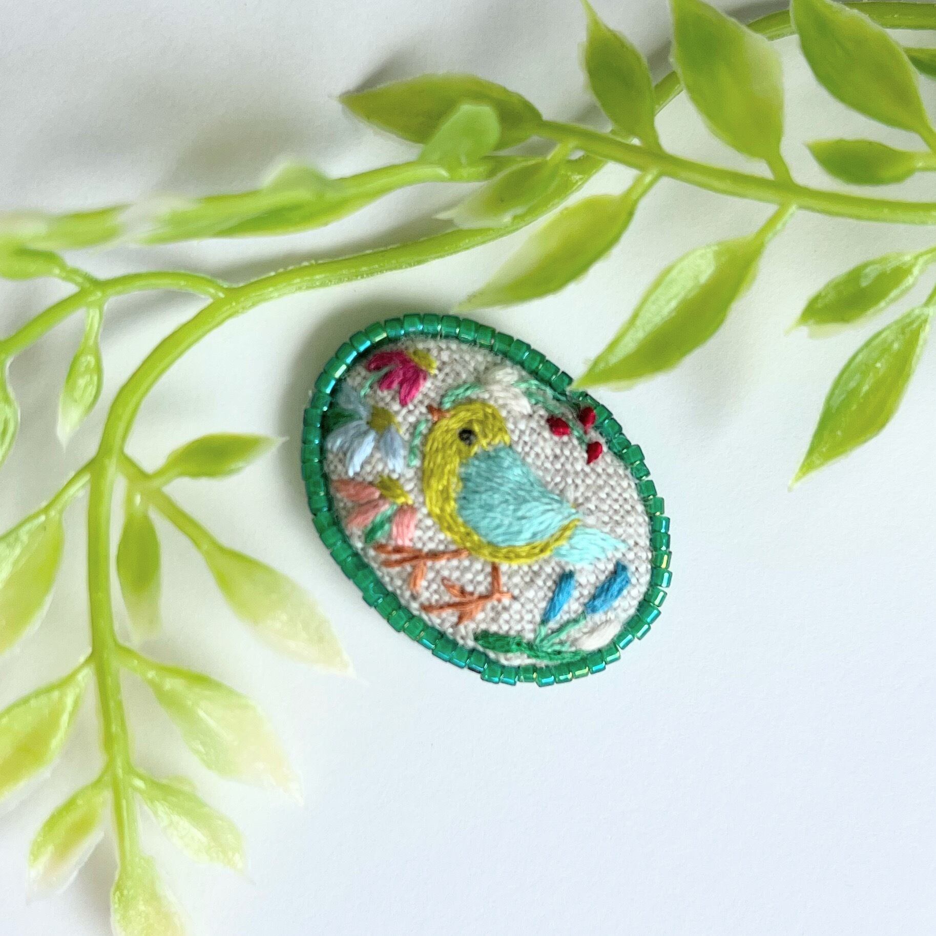 ナチュラルカラーのリネンにことりと草花を丁寧に刺繍しました。周囲には小粒のグリーンのビーズをあしらいました。