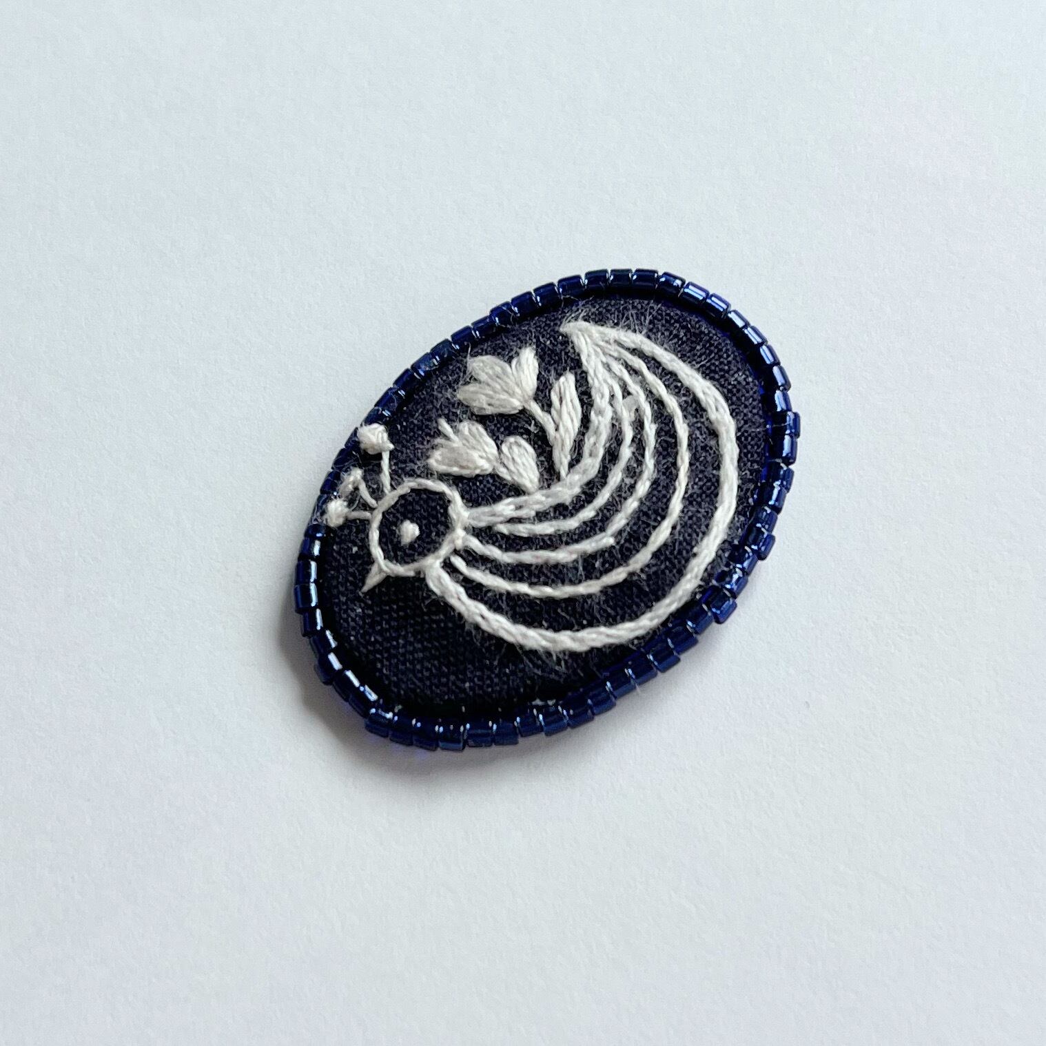 ビーズで飾った北欧風ことりの花籠の小さな刺繍ブローチ【hokuo】#174