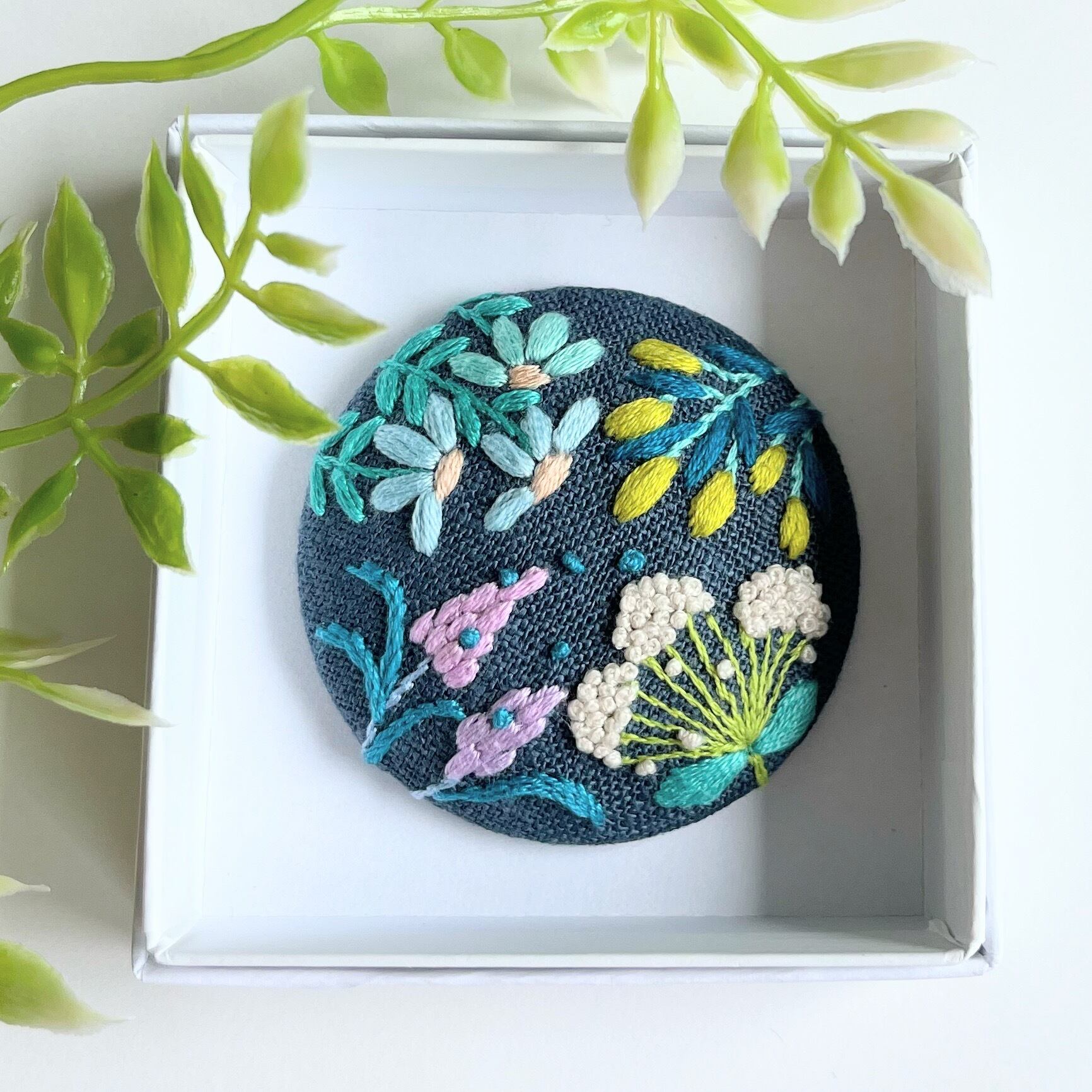 深いブルーグレーのリネン地に小さな草花を丁寧に