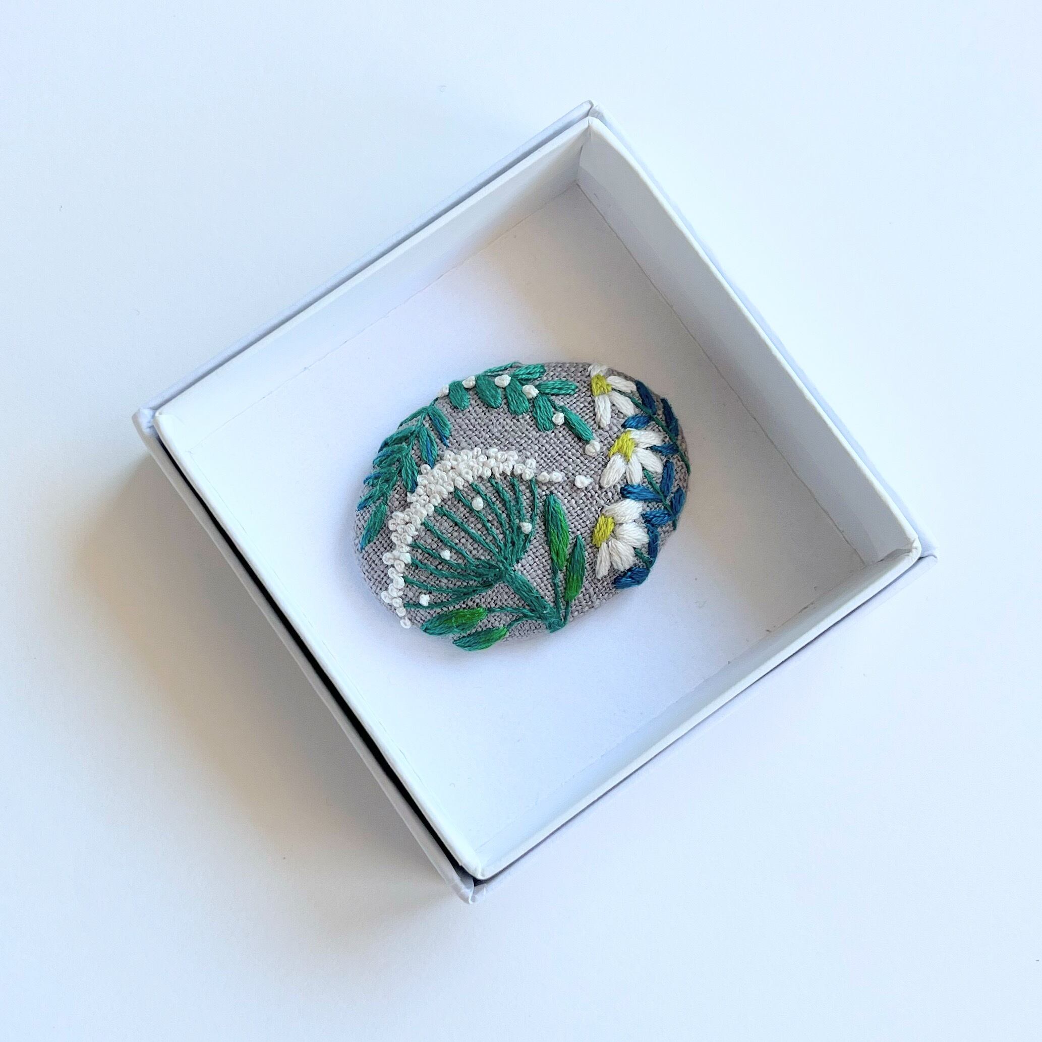 リネン地に小さな草花を丁寧に手刺繍しました。