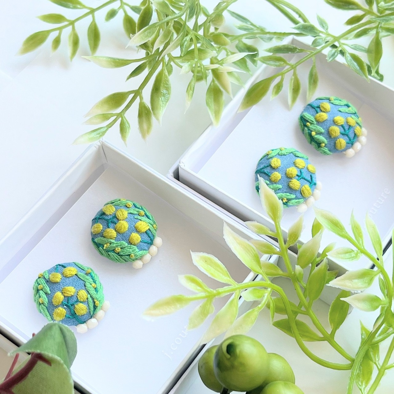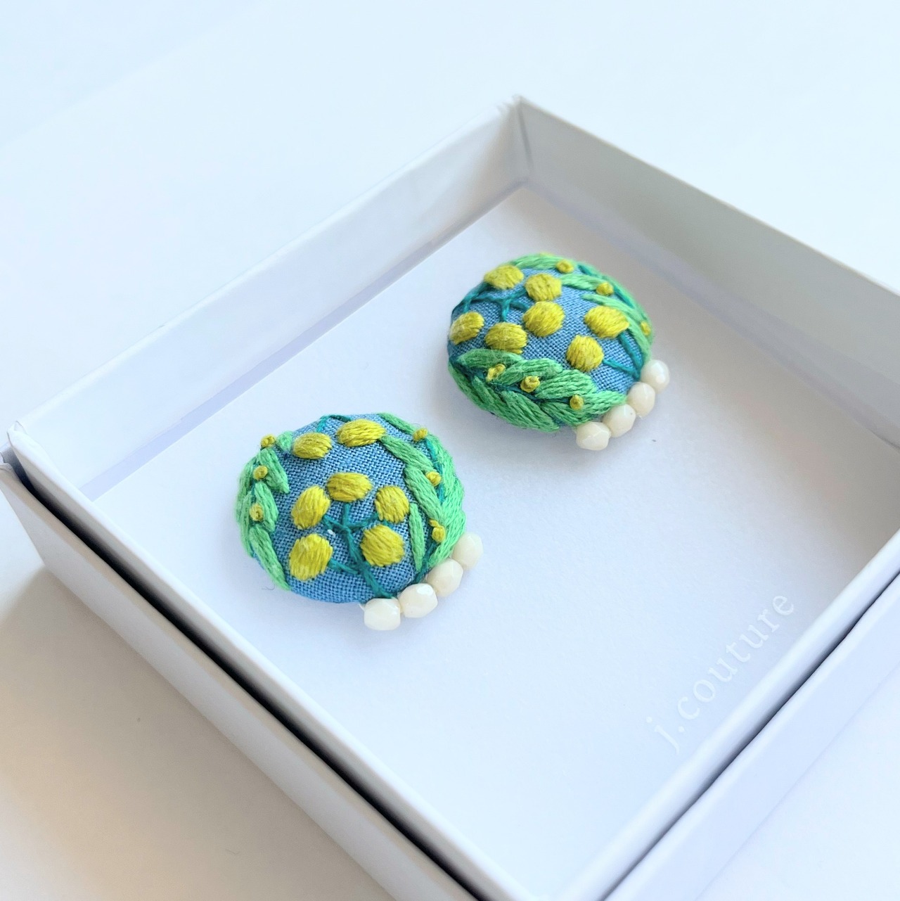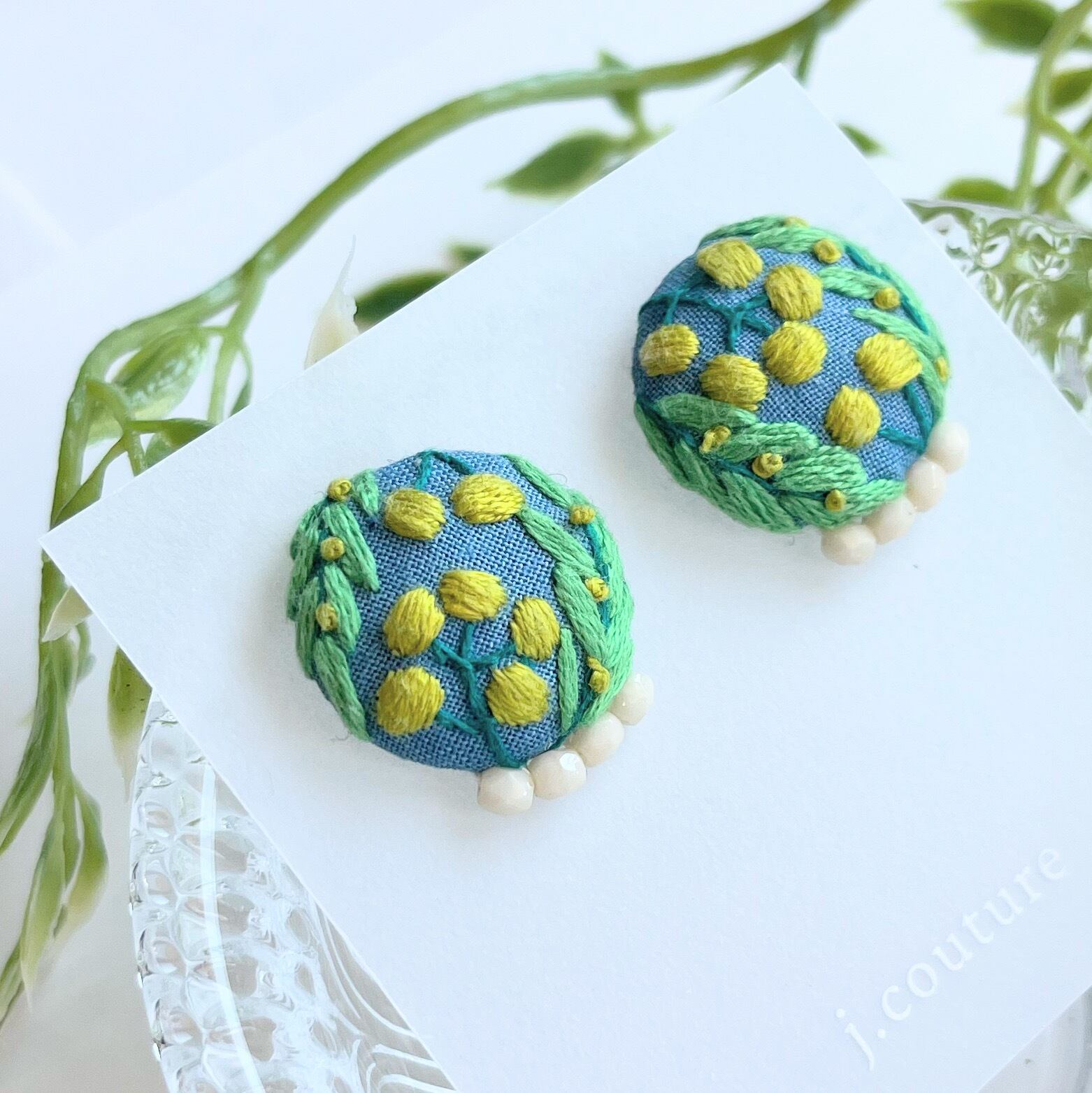 少しくすみのあるブルーのコットン地にカミモザを丁寧に刺繍しました。