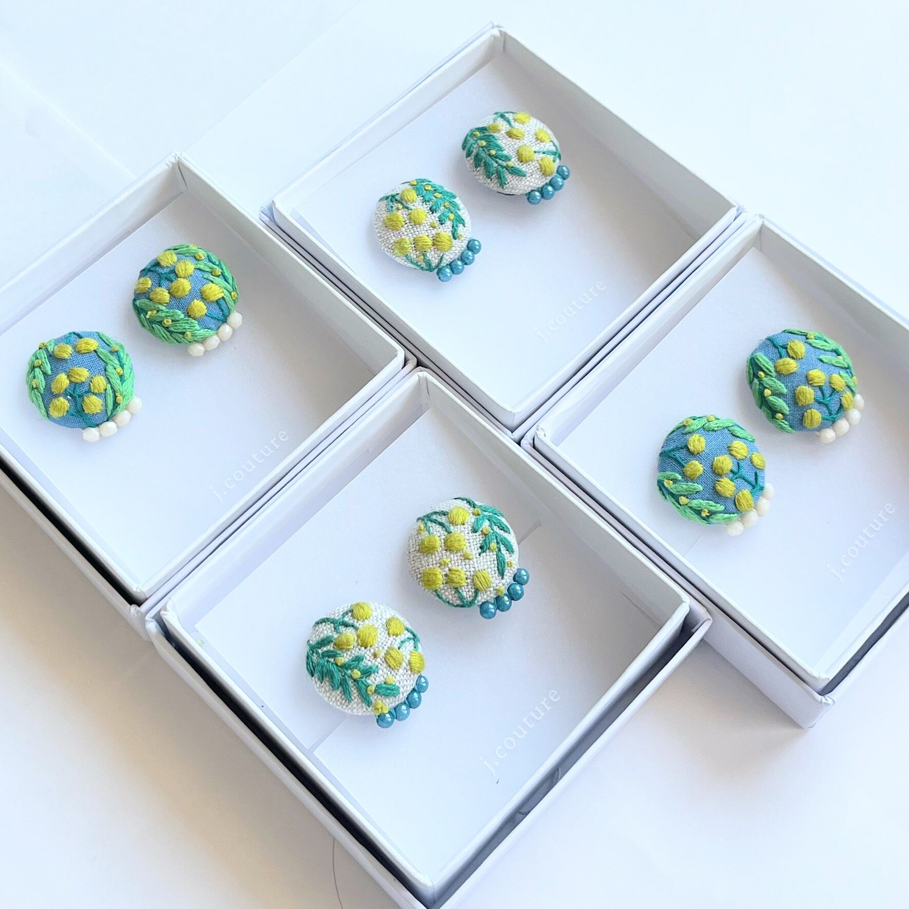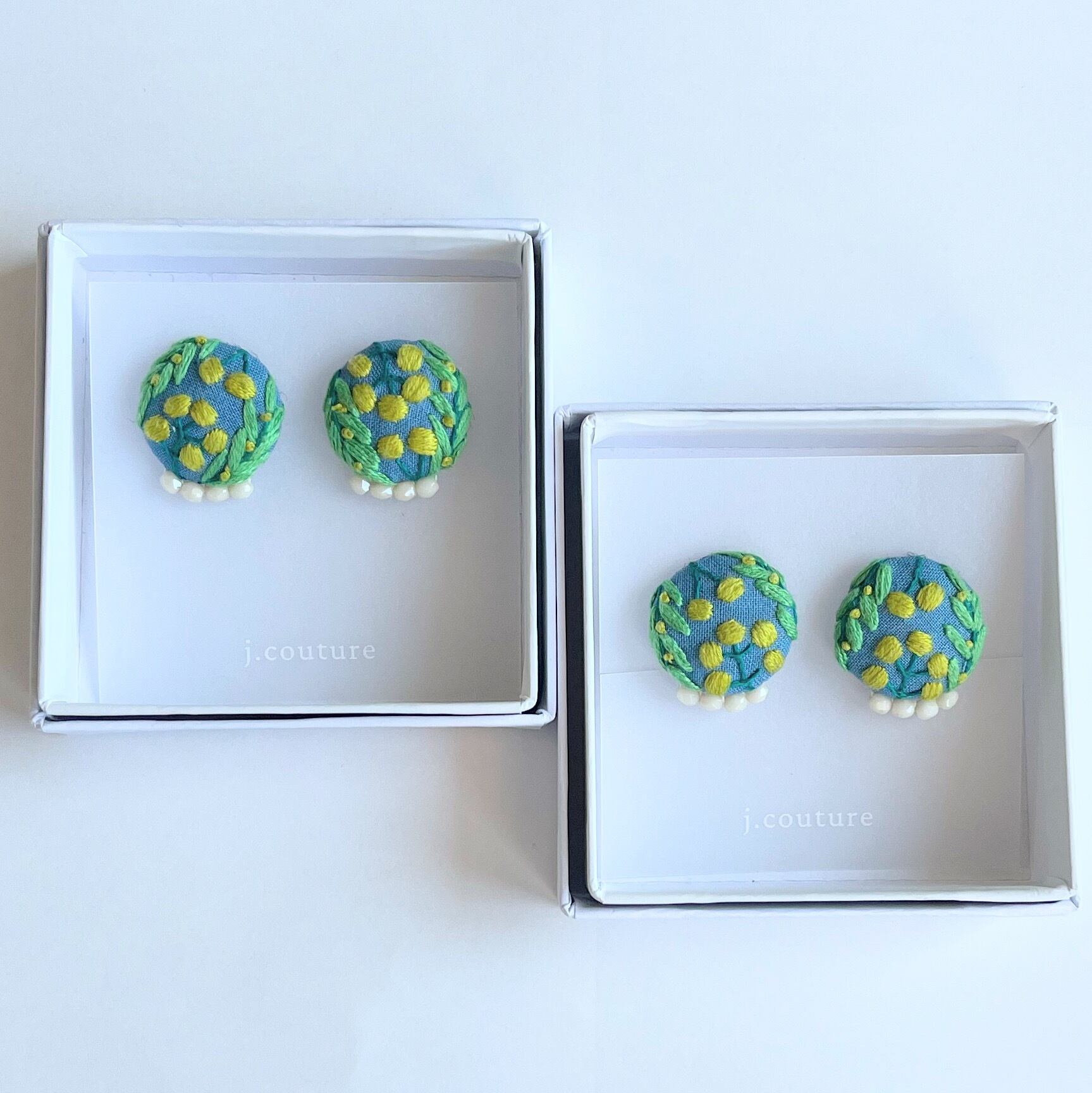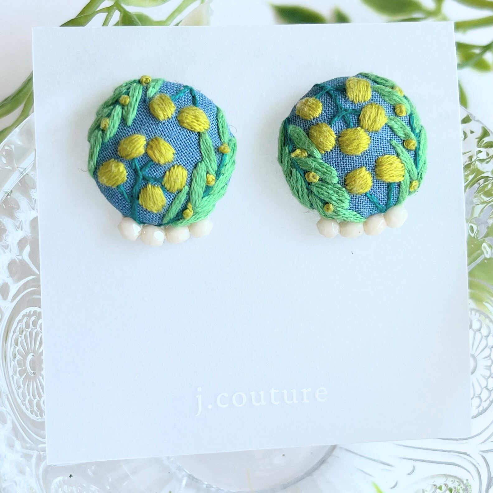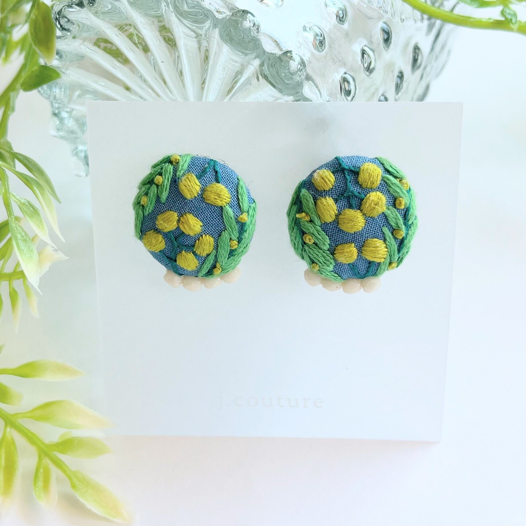 少しくすみのあるブルーのコットン地にカミモザを丁寧に刺繍しました。