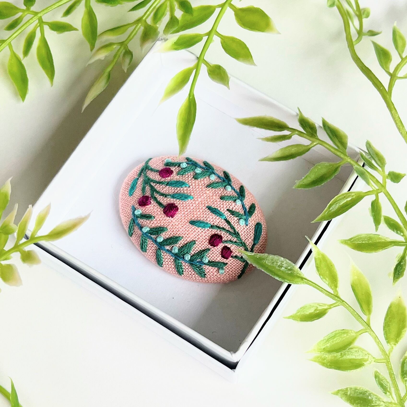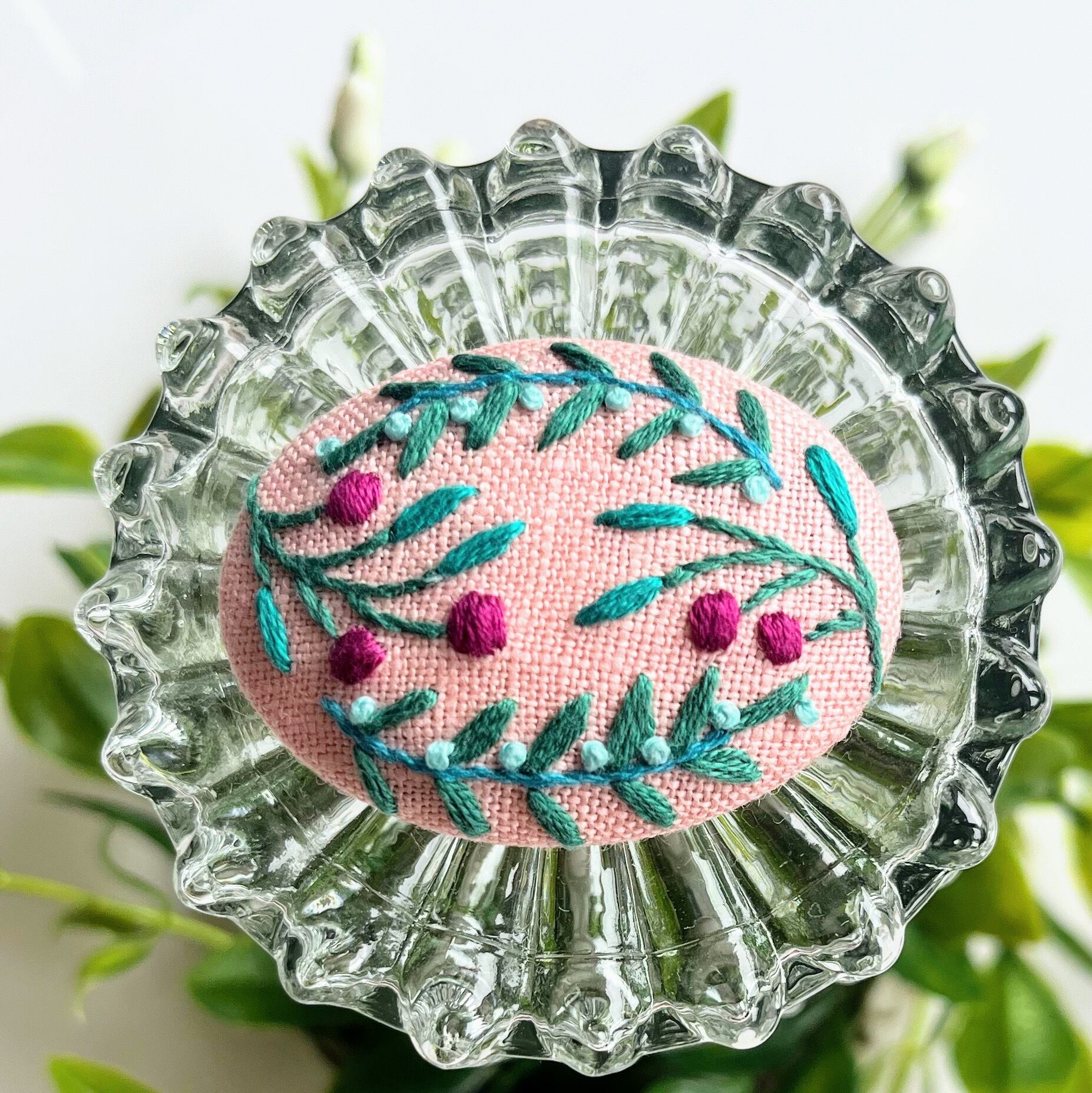 桃色のリネン地に小さな草花を丁寧に手刺繍しました。
