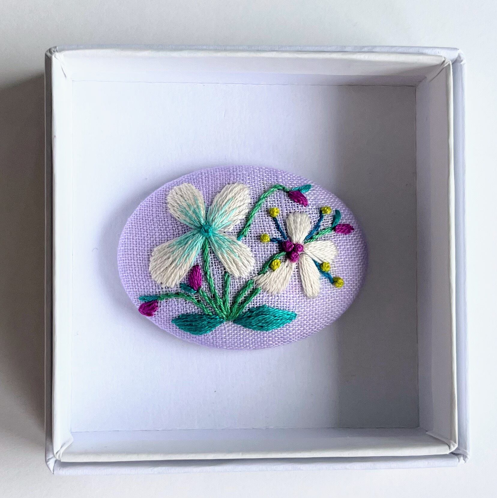 淡いラベンダー色のリネン地に小さな草花を丁寧に手刺繍しました。
