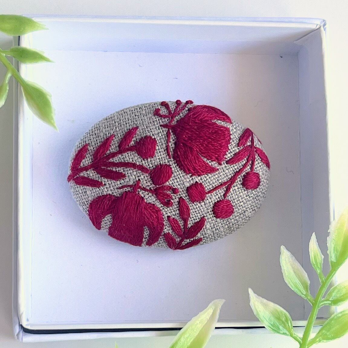 ナチュラルカラーのリネン地に小さなことりと草花を深めの赤い糸で丁寧に刺繍しました。