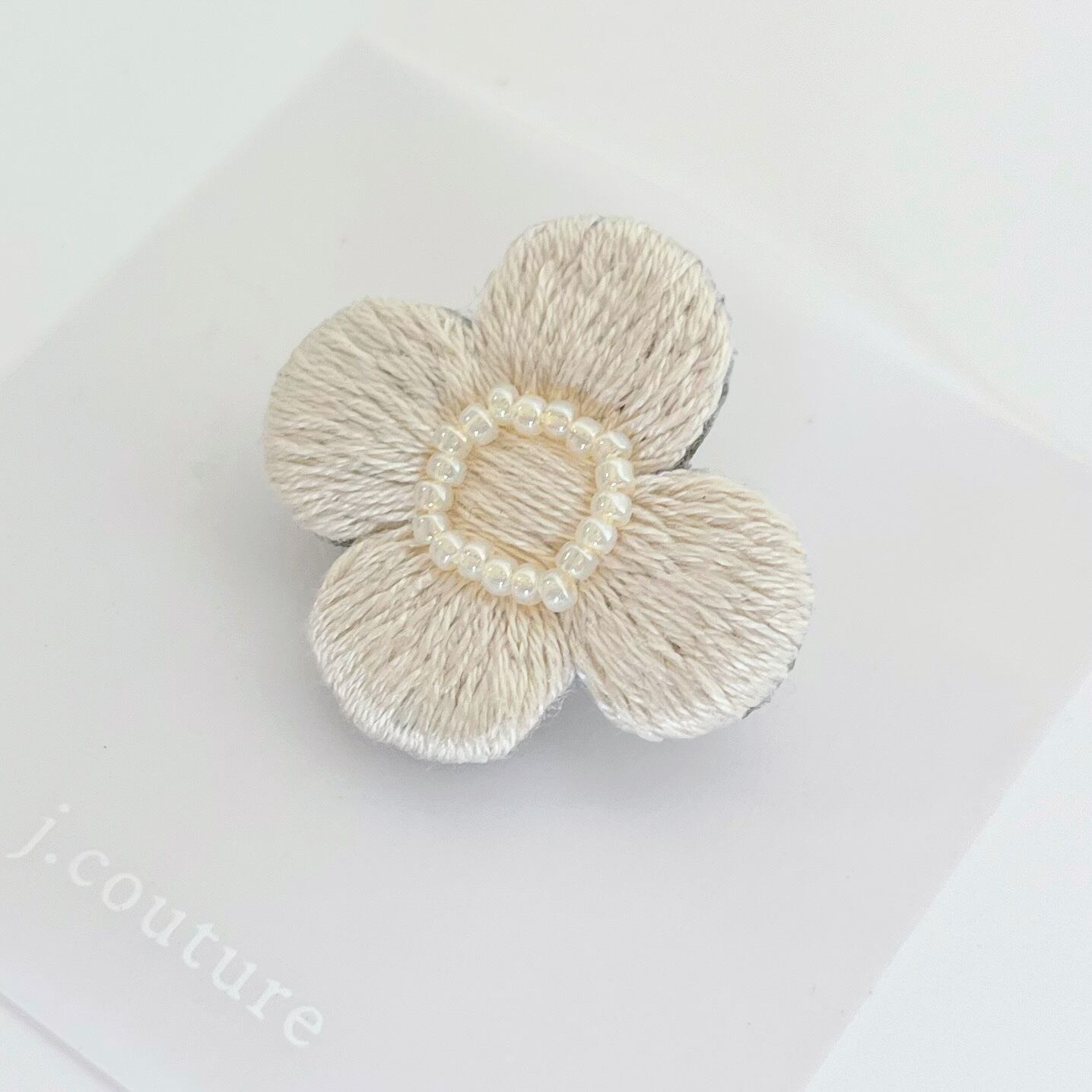指先乗るほどの小さなお花をオフホワイトの糸で丁寧に手刺繍しました。中心は小粒のバールビーズをあしらっています。