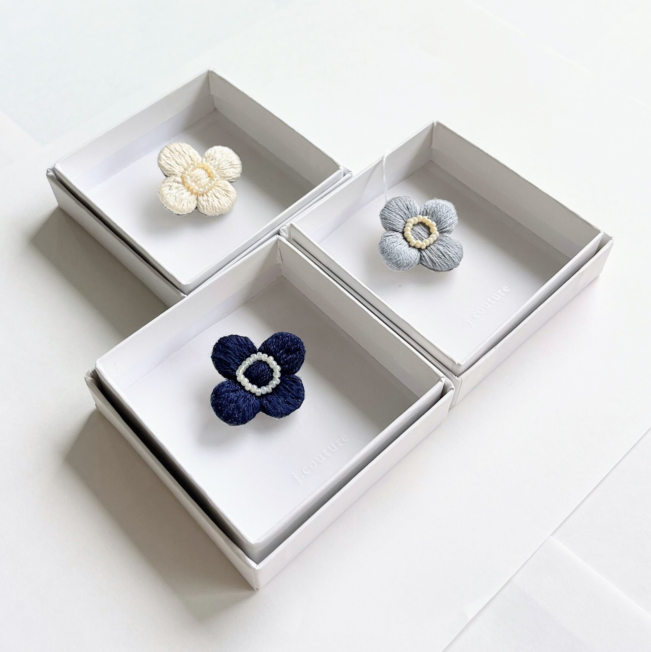 指先乗るほどの小さなお花をネイビーの糸で丁寧に手刺繍しました。中心は小粒のバールビーズをあしらっています。
