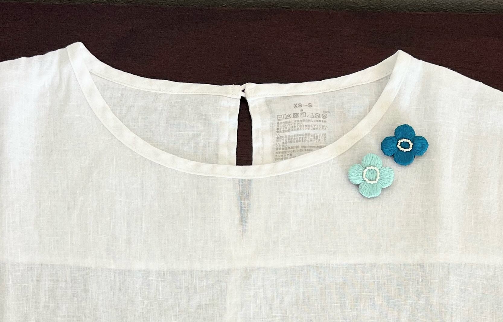指先乗るほどの小さなお花を淡い水色の糸で丁寧に手刺繍しました。中心は小粒のバールビーズをあしらっています。